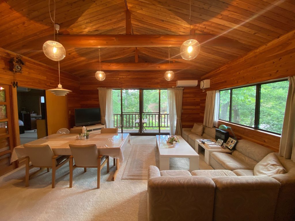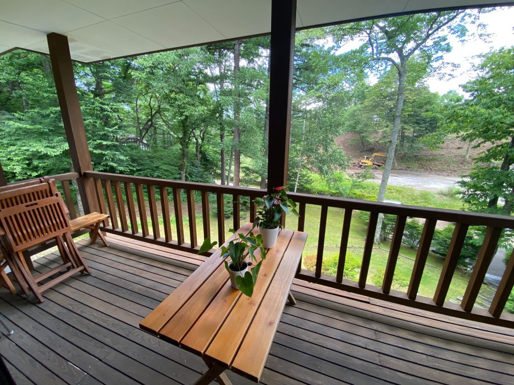 100坪以上の広い庭はしっかりと管理され、バーベキューなどができるスペースもあります。敷地外周には、手入れの行き届いたドウダンツツジが美しく立ち並び、春には新緑、秋には紅葉と軽井沢の四季を楽しむことができます。バルコニーからは庭や周囲の自然を一望できる開放的な景色が広がり、リラックスしたひとときを楽しむことができます。。